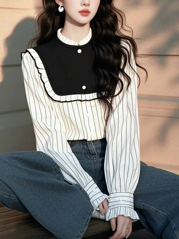 2025 Spring Han Han Super Beautiful Beautiful Black And White Striped Shirt Female Design Sense Light Luxury To Reduce The Age Of The Gas Blouse HZ1208