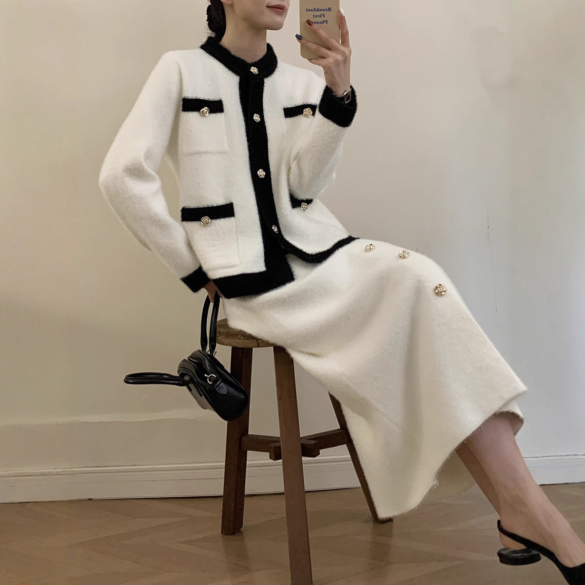 Solid-Color Knitted Sweater Set Hottie Simple Cardigan Ass Skirt Set Winter Two-Piece Set HZ1208