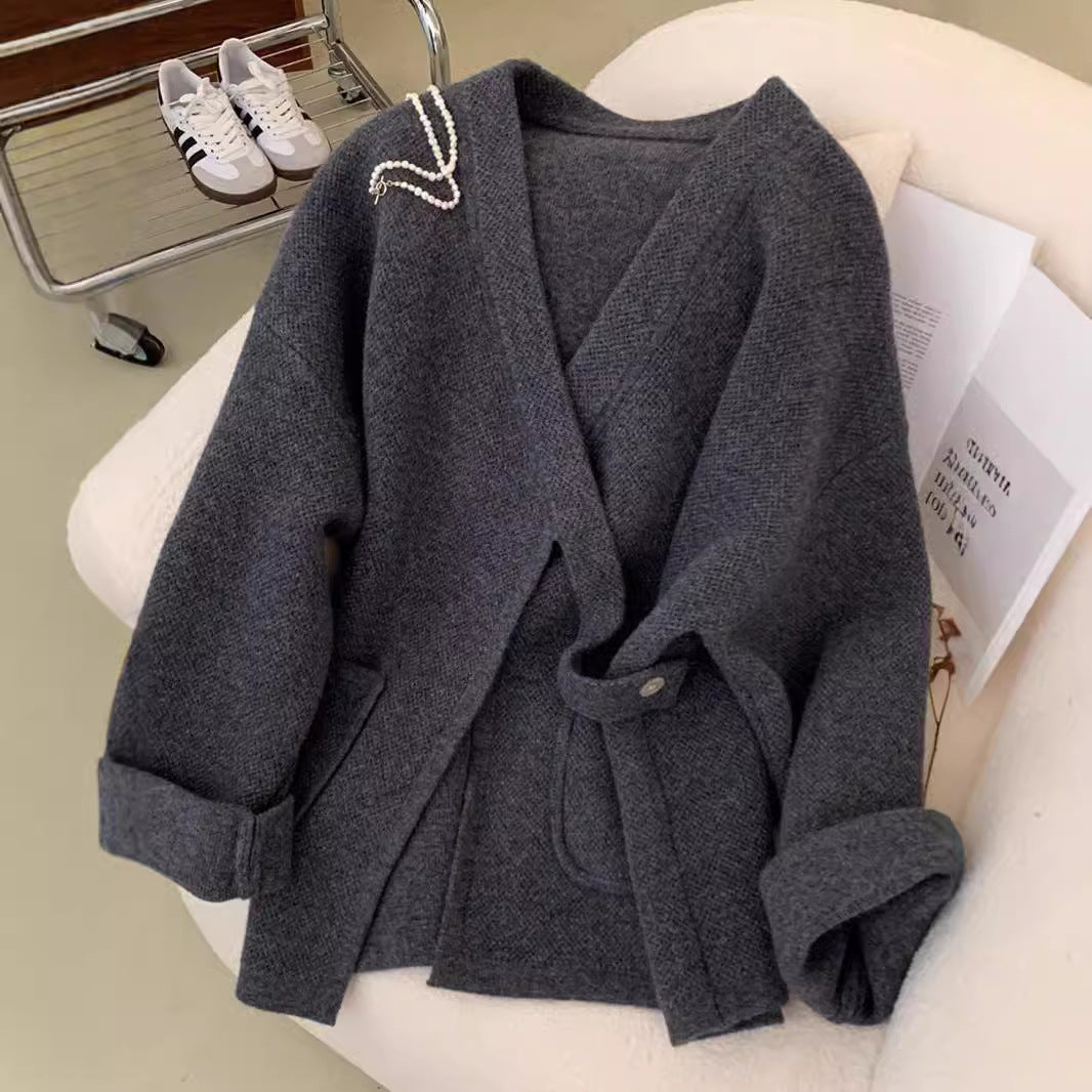 Hot White With Soft Knitted Cardigan Female Retro Buckle Gray Wool Sweater Coat In Wind HZ1208